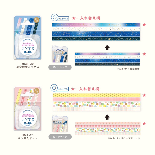 細いテープ幅で手帳やカードなどのデコレーションが楽しめる「ホソマス」 統一感のある4種のデザインのマスキングテープがテープカッター付きの透明ケースに入っています。 コンパクトで持ち運びにも便利なケースには、その日の気分や用途に合わせて他のテープを入れることもできます。 今回のパッケージリニューアルを機に、一部柄を入れ替えてバージョンアップしました!もちろん新作柄も仲間入りして、より賑やかに。 |