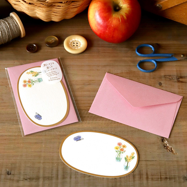 日々の暮らしのシーンを丁寧で温かみのある刺しゅうで表現したオーバル形のミニカードセットです。 カードの縁には刺しゅう枠をイメージした金箔加工、イラスト部分には刺しゅうの立体感を表現したエンボス加工を施しています。 |